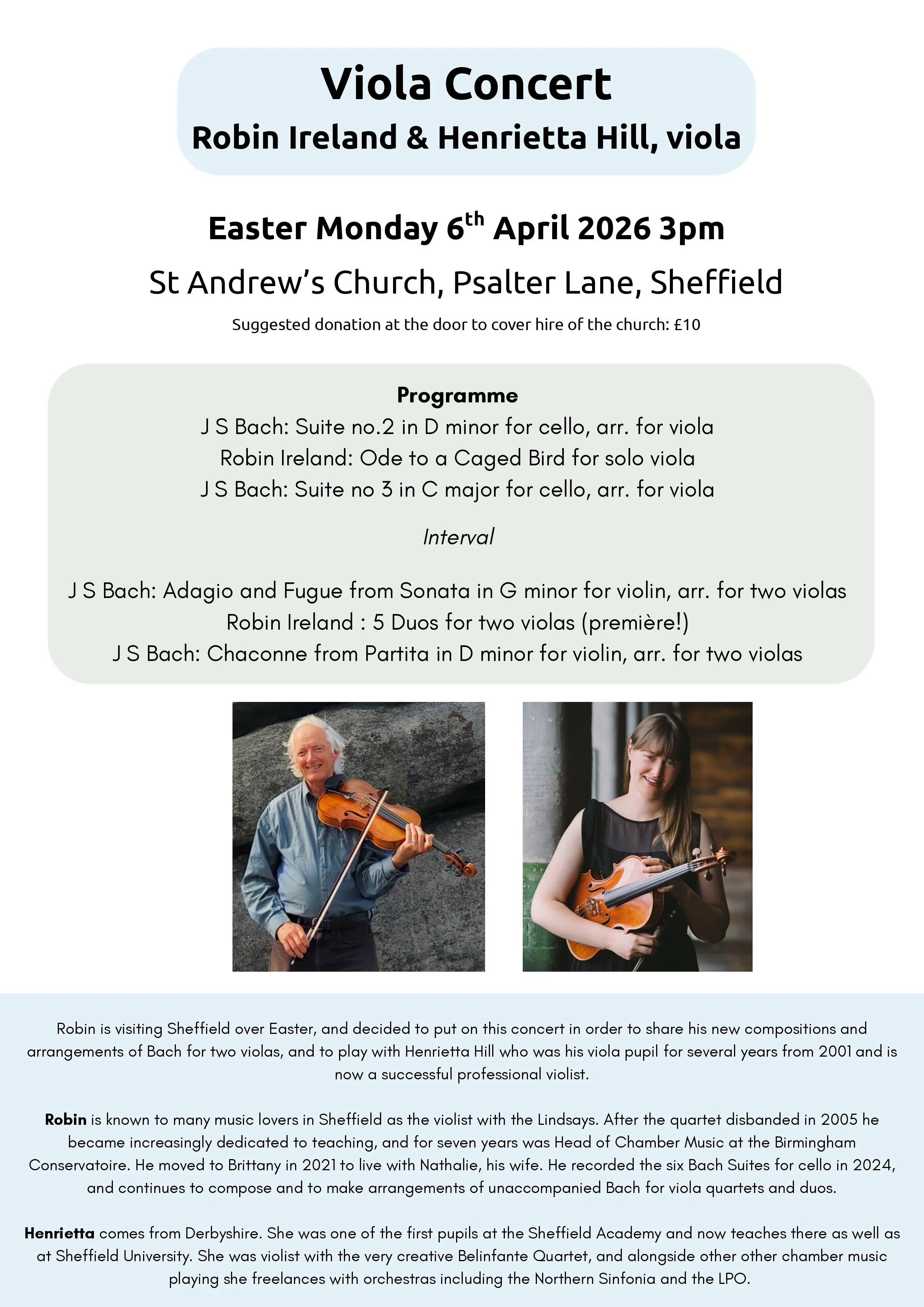 Viola Concert Monday 6 April 2026 15:00 17:00 St Andrew's Psalter Lane Church 31 Psalter Lane Sheffield, England, S11 8YL United Kingdom (map) Google Calendar ICS