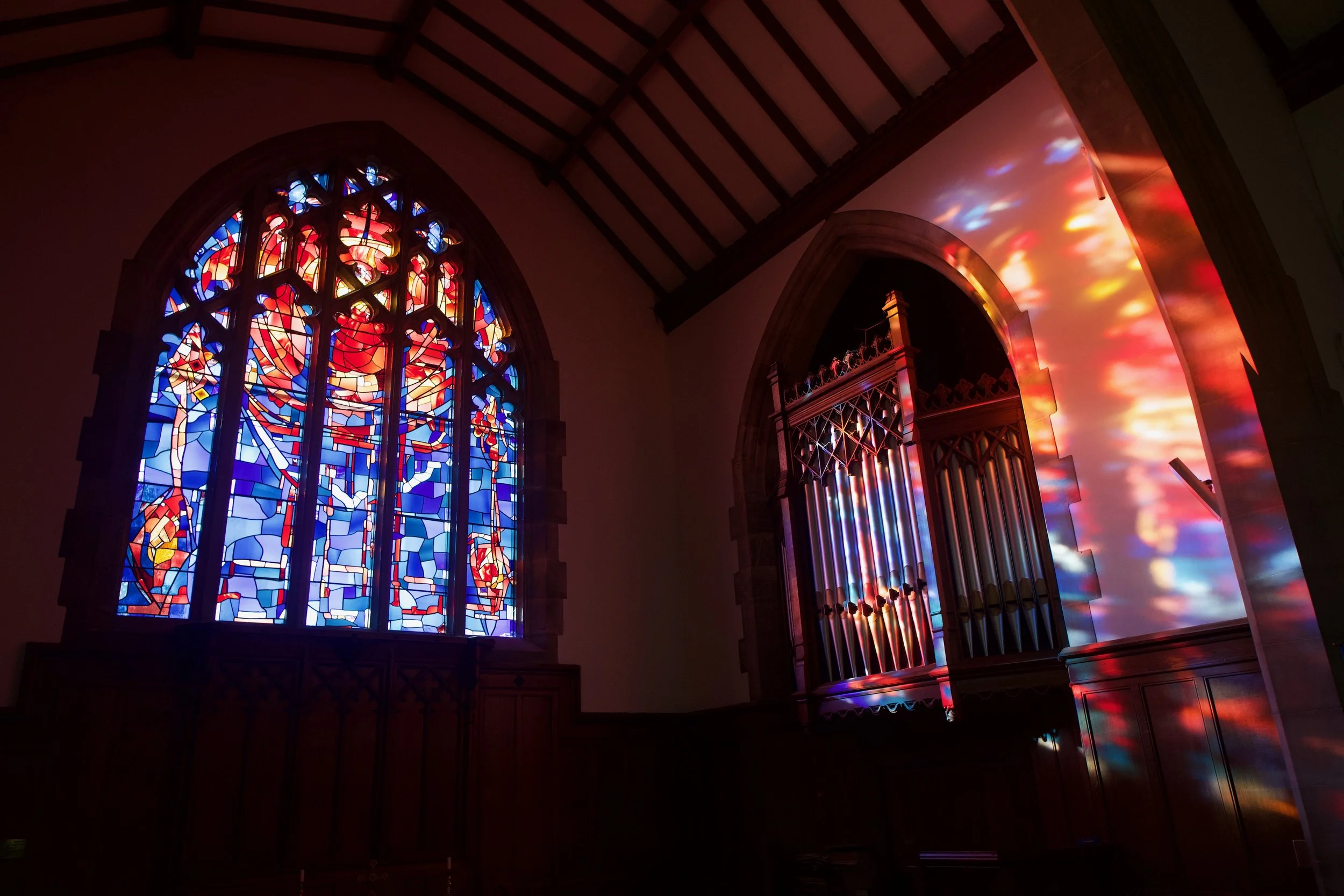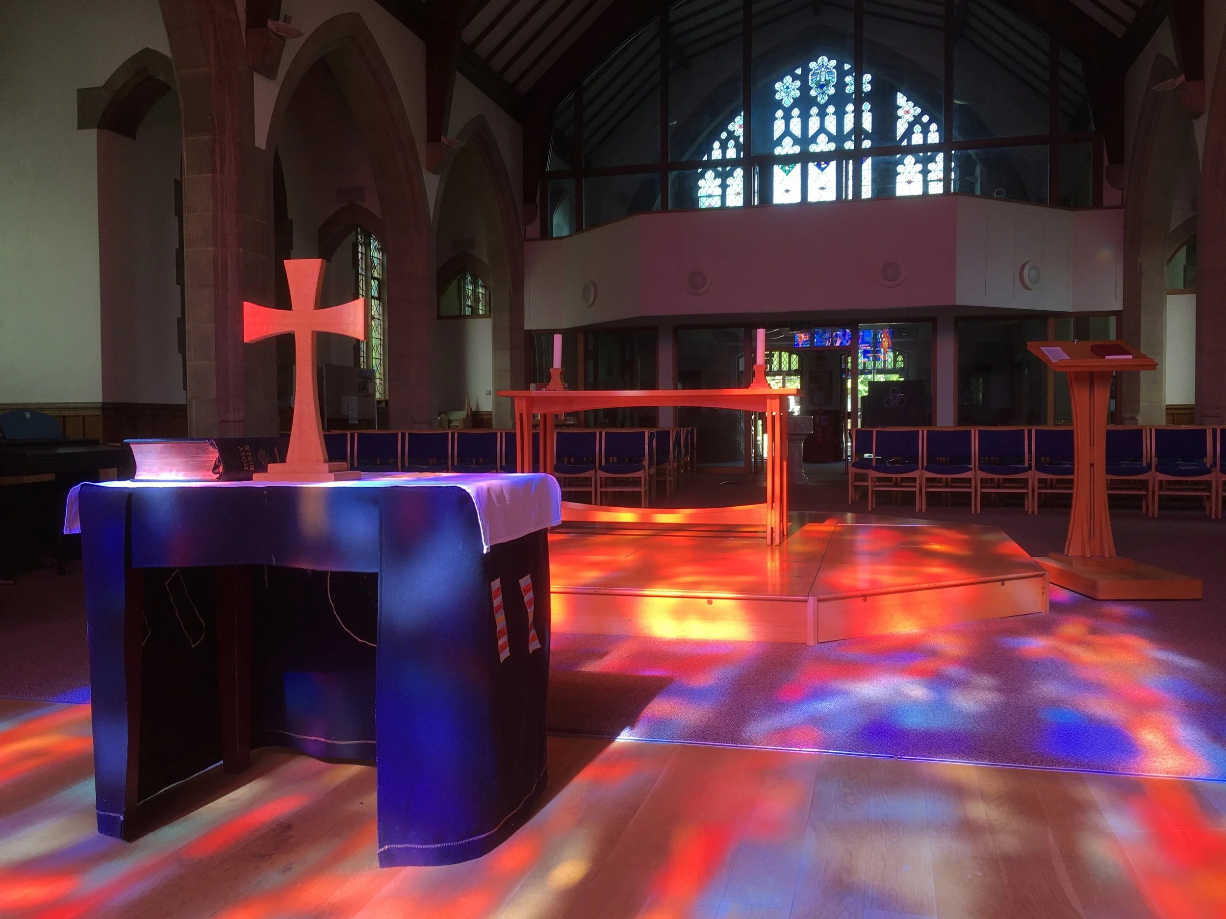The window casts beautiful colours across our building and contains symbolisim and emotion for us to focus on during our worship.